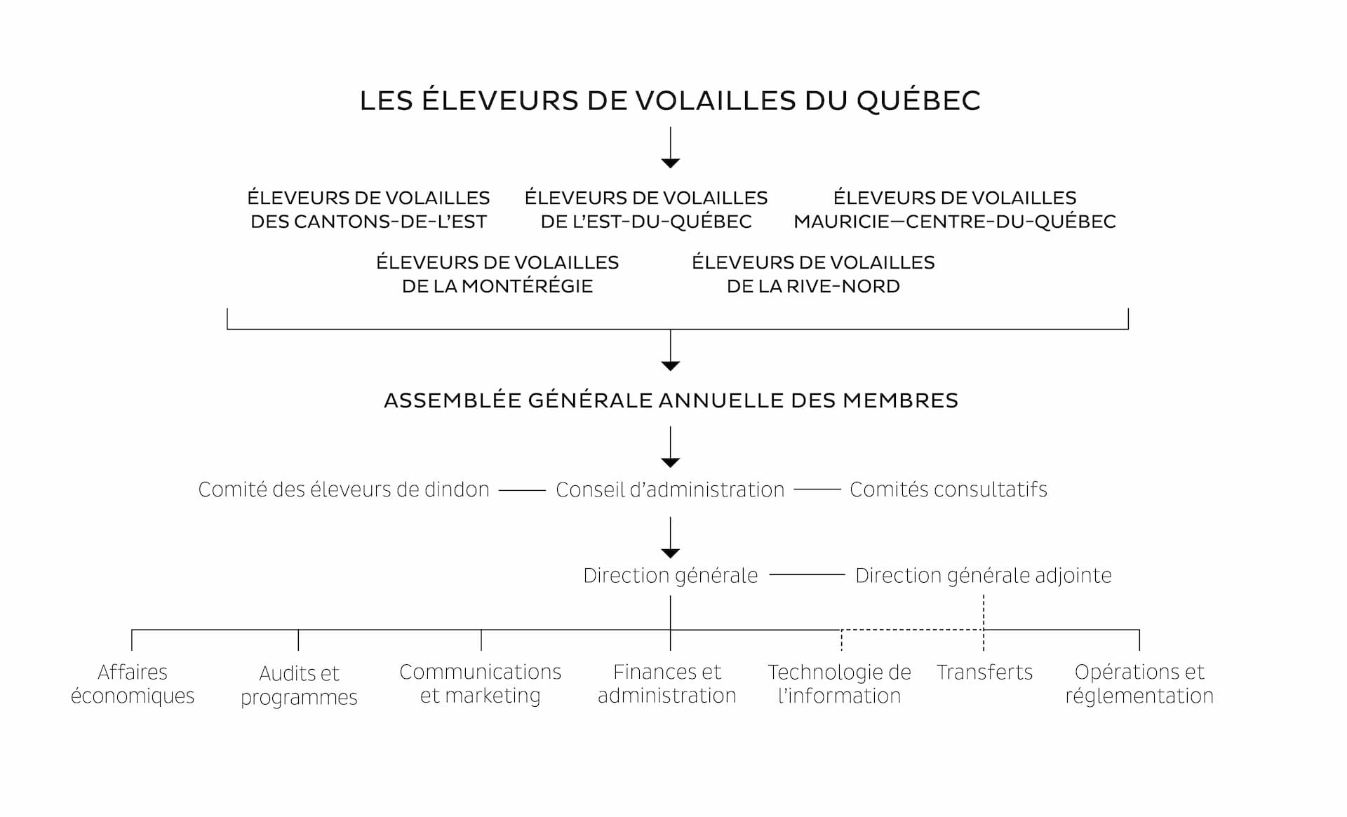 Élus à tous les deux ans dans leur région respective, les présidents et les premiers vice-présidents des syndicats régionaux forment le conseil d’administration. Un membre du comité des éleveurs de dindon en fait également partie. À la conclusion de l’Assemblée générale, ces derniers élisent entre eux un président, deux vice-présidents et deux membres qui formeront le comité exécutif. Le conseil d’administration décide des orientations à donner aux politiques, à la réglementation et aux questions qui concernent les Éleveurs de volailles du Québec. De son côté, le comité exécutif voit aux affaires courantes et s’assure de l’application des décisions du conseil d’administration.